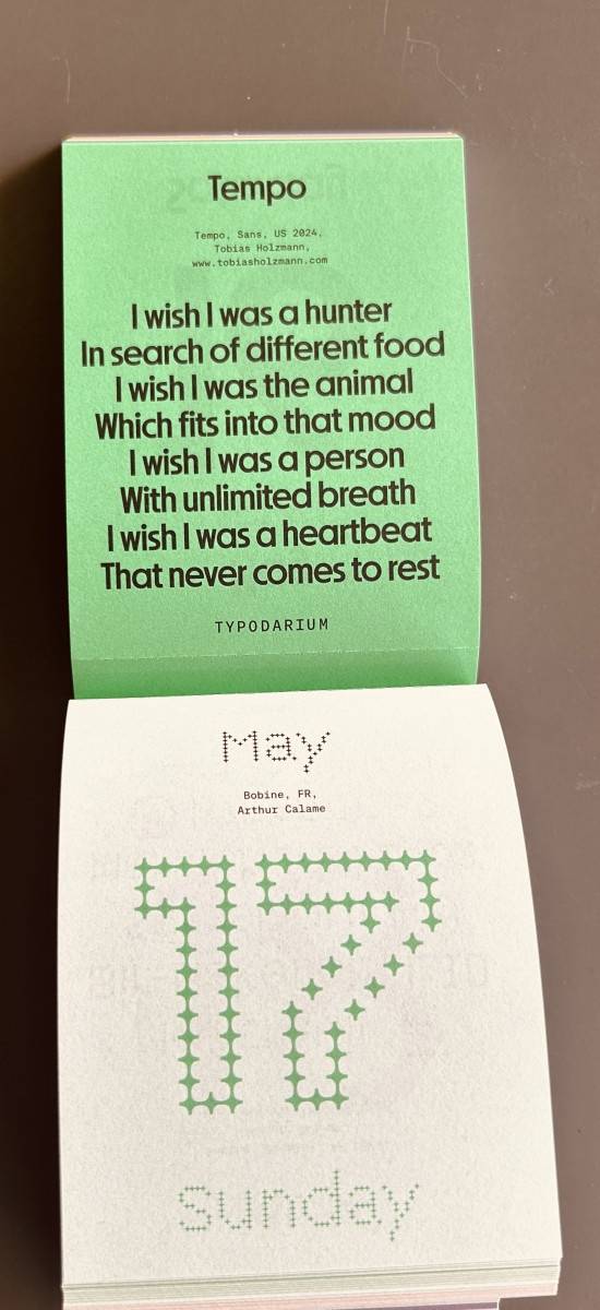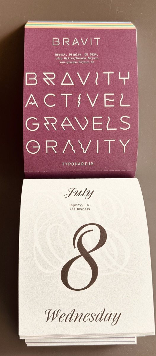 Jährlich neu erscheint mit den unterschiedlichsten Typen versehen das Typodarium. 365 Mal gibt es eine typische Tageszahl des Kalenders. Auf der Rückseite (die Hintergrundfarbe wechselt monatlich) findet man rudimentäre Textzeilen, die Lust auf mehr machen können. Das Typodarium gibt es weiterhin jährlich immer mit neuen und anderen Schriften beim Verlag Hermann Schmidt in Mainz.