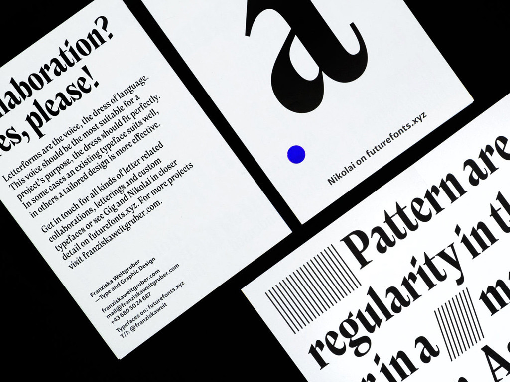 »Man muss sich irgendein Regelwerk zurechtlegen, ansonsten ist es natürlich eine unendliche Geschichte.« Ein Regelwerk mit Spielraum, das Wandel zulässt: Breitenachsen, Gewichte, Module. Auf Future Fonts veröffentlicht Franziska Weitgruber einige Schriften vorab, bevor sie fertig sind. Käufer:innen werden Teil des Entwicklungsprozesses. Unvollkommenheit wird Methode – ökonomisch wie gestalterisch.