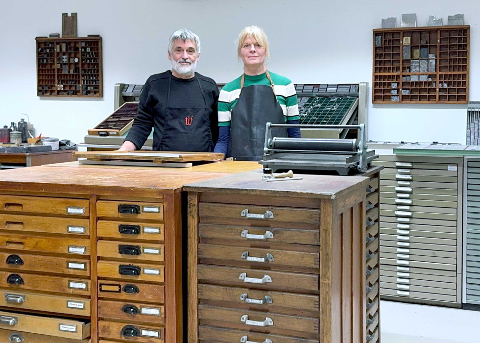 Offizin August & Stehsatz – das sind Sybille Schmitz (Gestalterin und Dozentin) und Paul Plunger (Gestalter und Dozent). Vor allem aber besitzen die beiden eine große Leidenschaft für Typografie und Bleisatz. Sie arbeiten seit 2025 zusammen und verfügen mittlerweile über eine gewichtige Werkstatt mit etlichen Abziehpressen und Tiegeln, zahlreichen Schriften in Blei und Holz in vielerlei Schriftgraden, sowie einer Vielzahl an Schmuckmaterialien.